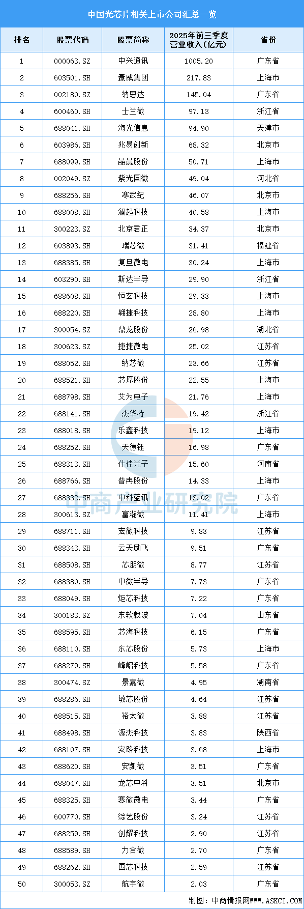 目前,光芯片相關A股上市企業中,廣東省和上海市數量最多,均為13家,并列第一。江蘇省共9家,排名第三。